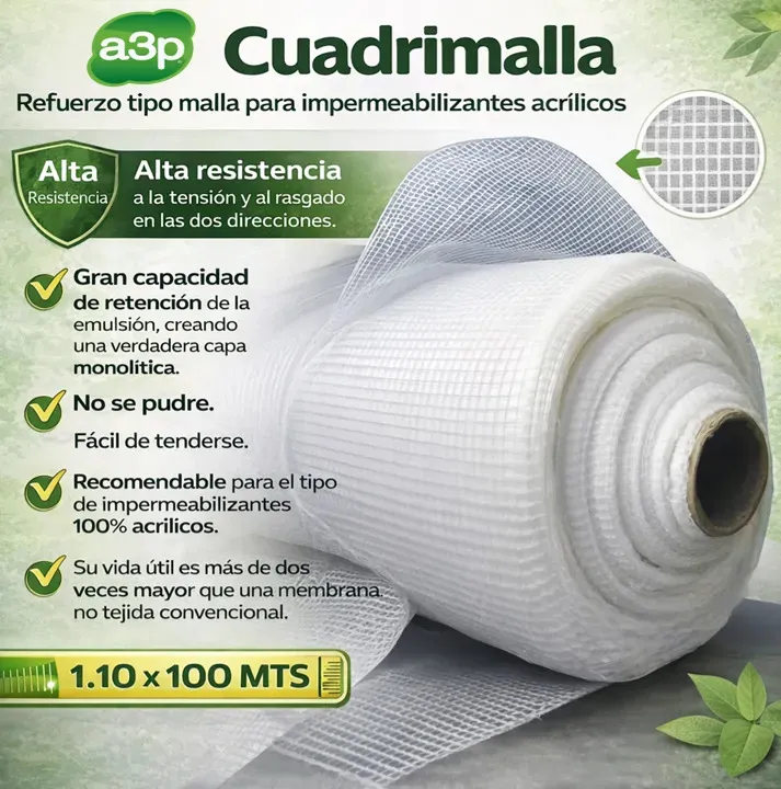 Como membrana de refuerzo para sistemas de impermeabilización acrílica y como refuerzo de zonas críticas para puenteo de fisuras en techos, muros, juntas estructurales, chaflanes, etc.